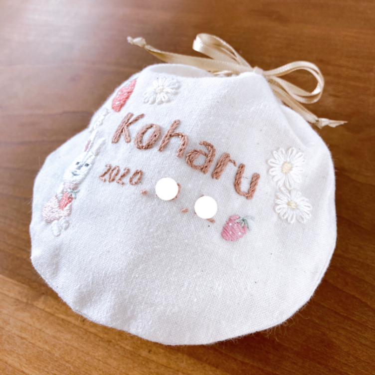お名前刺繍の丸い巾着 うさぎと苺 名入れ オーダー頂いたモチーフを刺繍 出産祝い 誕生日ギフト へその緒 赤ちゃんファーストカット髪の毛 産毛 胎毛 乳歯 おしゃぶり ベビーヘアバンド ヘアクリップ Tanomake タノメイク 欲しいものが頼めるオーダーメイド特化型